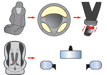 Your seat should be adjusted so that you are comfortable and be able to have full control with maximum visibility. You should be able to push the clutch pedal down to the floor and back up smoothly without stretching or hitting your leg/knee on any other of the controls. You should correctly adjust your head restraint to minimise whiplash in the event of a collision. You should be able to run your hands around the steering wheel without having your arms stretched out. Everyone must wear a seat belt unless they have an exemption document and the driver becomes legally responsible for passengers under the age of 14. Adjust your mirrors to maximise the view to the rear and sides of your vehicle, further details can be found in other recap sheets.